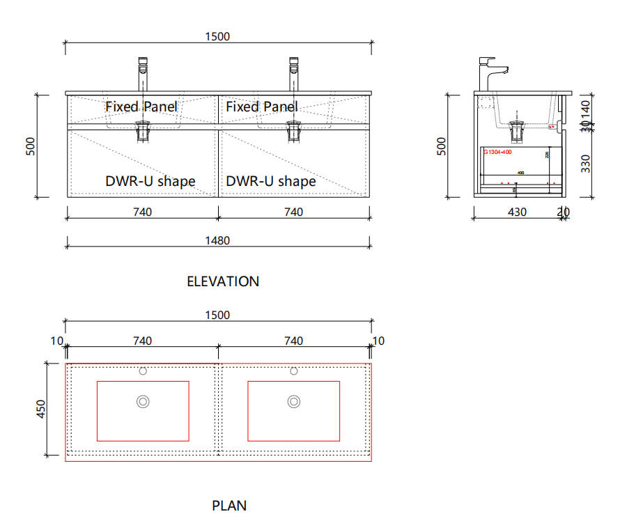 1500 vanity: 1500mm (W) × 460mm (D) × 520mm (H)